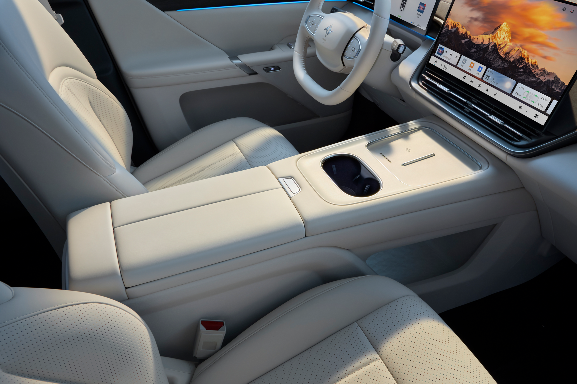 内饰设计则兼具质感与温度,车内触手可及之处,面料全面升级为“云感亲肌”超软材质,搭配全新内饰色“暖山玉白”,大幅提升了内饰的质感。细节之处更显人性化,经过改良的50W无线充电面板,表面采用仿麂皮材质,有效防止滑落;电释放内门把手采用按键开启设计,轻触即开;主副驾标配LED柔光美妆镜,光线柔和不刺眼。一系列优化从日常场景出发,让便利性与幸福感融入每一次出行。