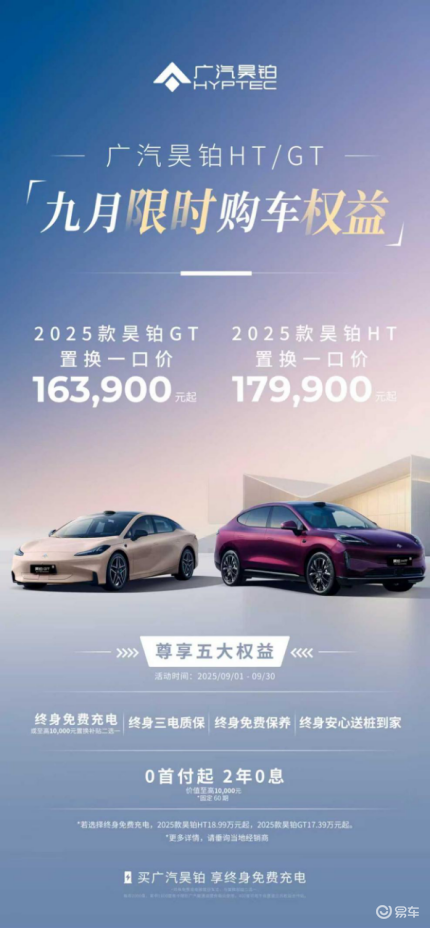 现在昊铂HT 825 Pro的购车权益很直接:三电终身质保、6年或15万公里整车质保、终身免费保养、终身送桩到家、终身免费充电,还有2年0息金融方案。