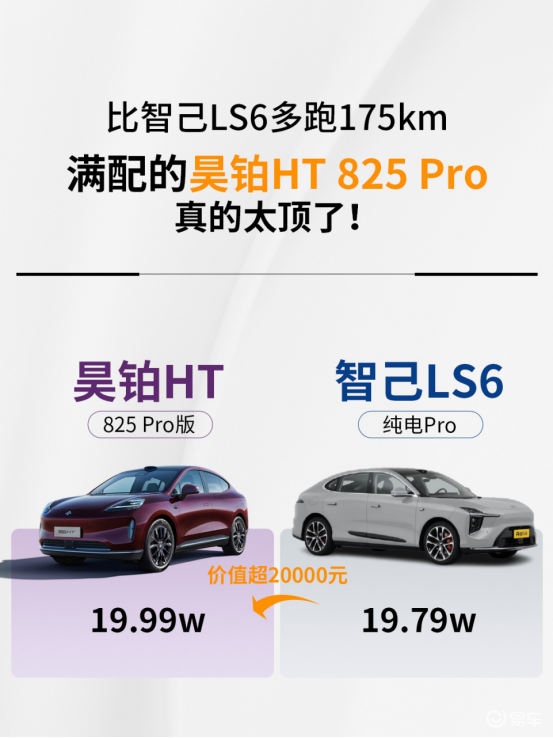 这时候,不少人都会看看市面上的热销车型,就比如终端价19.99万的昊铂HT 825 Pro,以及终端价19.79万智己LS6 纯电Pro,这两台车的终端价格都卡在20万以内,实际车价差了2000块钱,该选哪一台,不少人就会有些纠结。