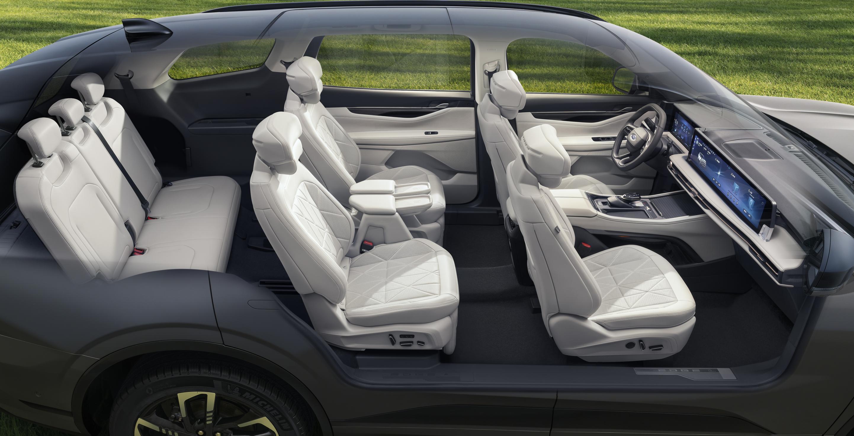 内部空间上,福特锐界L是同级唯一具备2-2-3和2-3-2座椅布局可选的大7座SUV。2-2-3布局下,二排座椅可使用电动调节,更有三种座椅一键调节模式,其中“一键舒躺模式”可自动调节至“座椅向后41度、腿托向上50度”的近零重力模式,带来媲美头等舱的乘坐体验。二排座椅还有同级少有的加热、通风功能,很好地照顾到了老人、孩子的出行体验。2排通道宽至200mm,比一些MPV还宽,成年人可以轻松走进第三排。