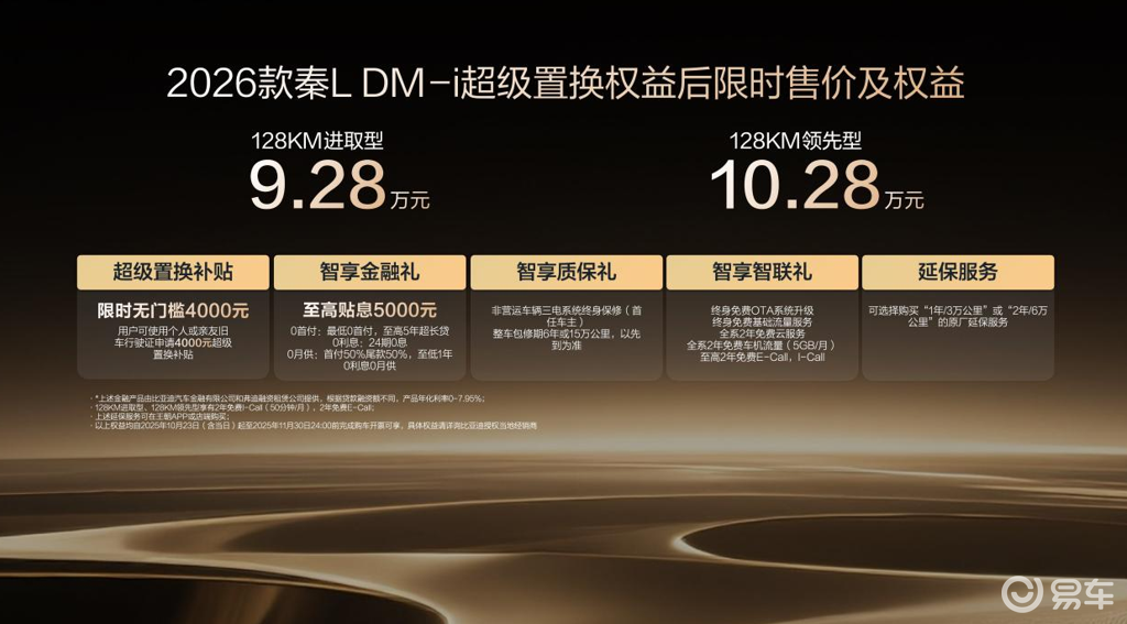 2026款秦L DM-i纯电续航为128公里,油耗进入“2字头”,NEDC百公里亏电油耗仅2.79L。同时老用户不用换车,通过OTA就能享受到全新的超低油耗,80公里款型更是可以低至2.6L。动力方面,新车有电驱系统有120千瓦、160千瓦不同功率电机可供选择