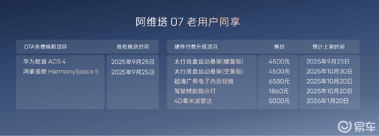 阿维塔07 2026款为年型改款车型,它保持了原款车型的尺寸与轴距不变,并新增晴蓝外观配色和岩棕内饰配色。在配置上,它全系标配四门电吸门和流媒体电子内后视镜,支持选装超清电子外后视镜和Halo交互屏;它搭载了35.4英寸4K全景远端屏,支持选装智能车载冰箱,配备了前排双零重力座椅和英国之宝音响系统;其座舱采用华为鸿蒙Harmony Space 5系统,提升人机交互体验。