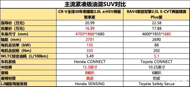 跟市场上其它优秀的同级HEV车型比较,在同等配置的情况下,东风本田CR-V e:HEV车型电机功率更大、驾驶起来电感更强;不仅车身尺寸更大,并且优秀的空间设计还带来同级中最大化的实际空间;更不要提CR-V e:HEV还能以比对手更低的价格提供品质更好的配置了。