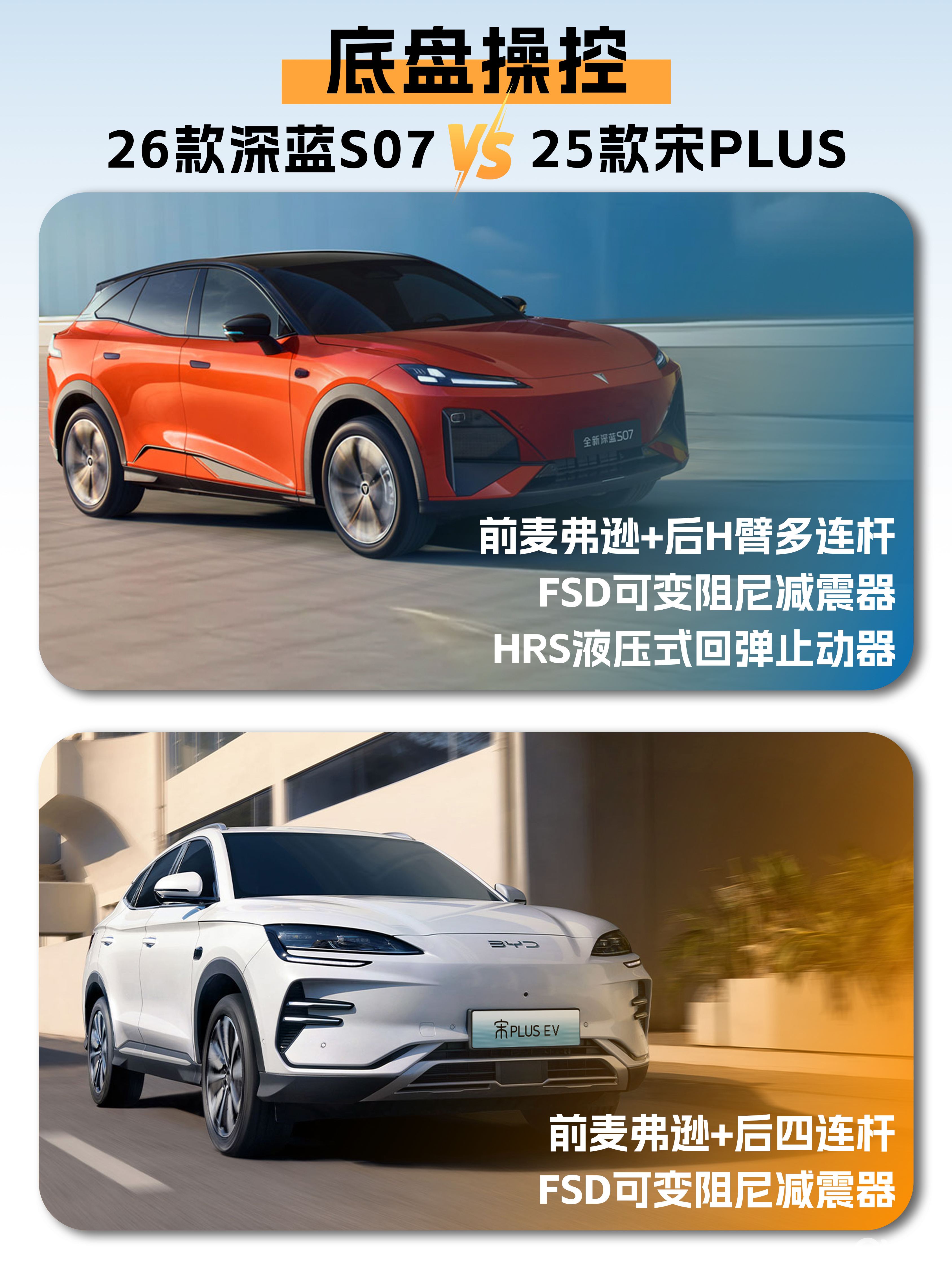 深蓝S07采用全新数字纯电平台架构,天生后驱基因,纯电后驱架构会有先天优势,动力驱动和转向互不干涉,实现更高效的能量传输和利用,使得转向更精准、更直接,尤其是在激烈驾驶或高速过弯时,能减少前轮驱动车常见的“扭矩转向”现象,消费者感知侧面就是过弯更平稳丝滑。后驱也可以更好的做到50:50黄金载荷分布,低重心布局带来天然平衡感。宋PLUS采用前置前驱布局,15万的纯电车型电机前置确实有点说不过去,前置前驱核心原因还是受制于成本有限的无奈之举。后驱成本更高,调教更为复杂,但是操控更好,这也是深蓝S07的后置后驱平台优势所在。 26款深蓝S07纯电版悬架形式采用前麦弗逊+后H臂多连杆结构悬架,并且后H臂采用铝合金材质,能有效减少簧下质量,使车辆操控起来更加轻盈灵活。同时全系新增了FSD可变阻尼减震器+HRS液压式回弹止动器,这套BBA级别的驾控系统能根据路面颠簸频率智能调节阻尼,有效吸收不同频段的震动冲击,过坑洼路段时车身姿态更稳,大幅降低乘客的晃动感。配合后置后驱平台,不仅提升了行驶质感,更让操控响应更快、极限更高,无论是城市通勤还是长途驾驶,都能兼顾舒适与驾驶乐趣。简单来说,26款深蓝S07的悬架刹车不点头、过弯不侧倾、烂路不颠簸、坑洼不弹跳、过减速带冲击更柔和。