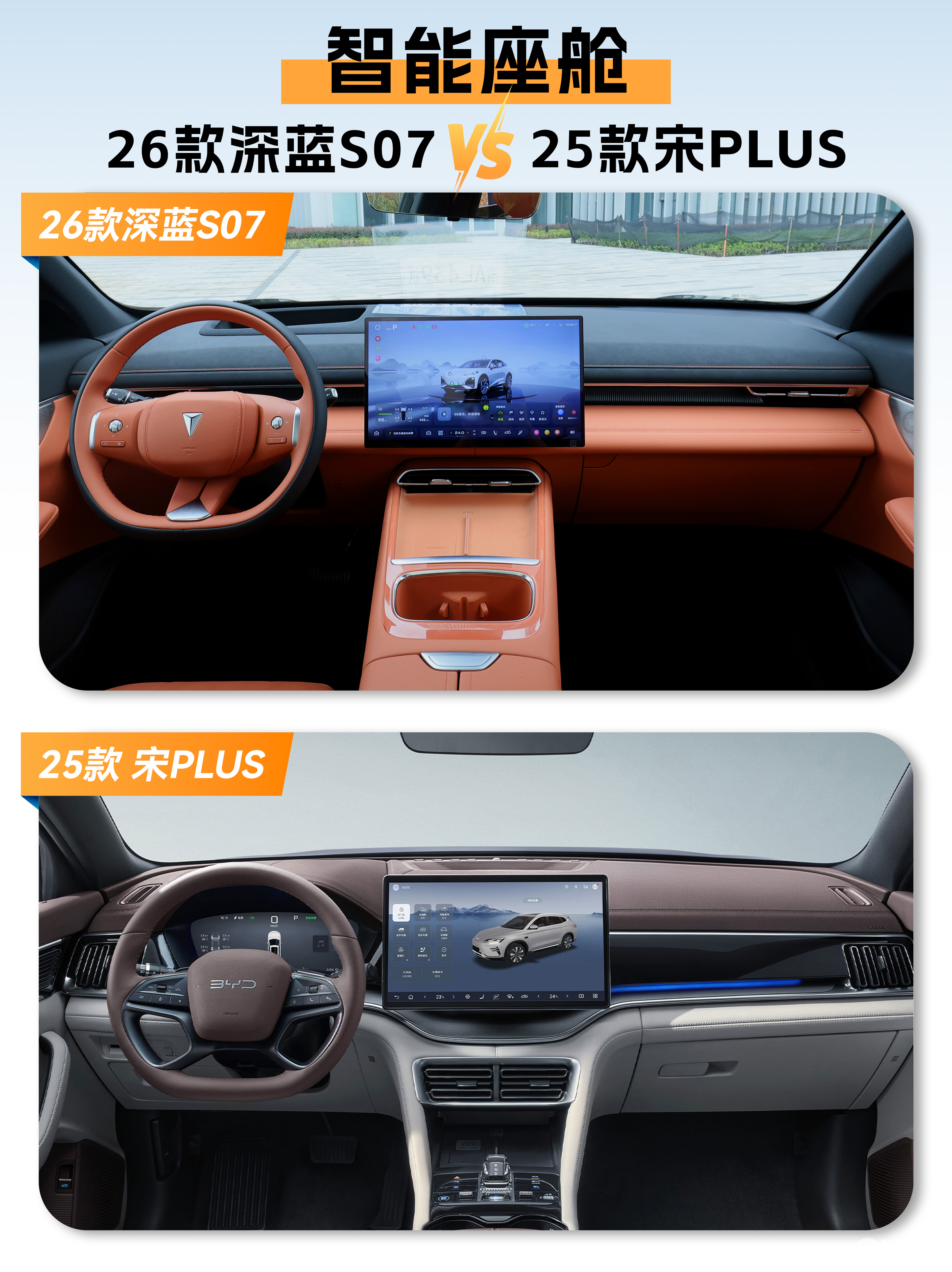深蓝S07智能座舱搭载Deepal OS 4.0智能操作系统,15.6英寸2.5K超清向日葵屏,支持左右旋转15°,遵循人体工学原理的最佳视角范围。配合高通第四代数字座舱平台骁龙8295P芯片,24G运行内存+256G存储空间,凭借强悍的AI运算能力与多任务处理性能,车机交互实现界面切换丝滑无卡顿。全座舱智能情景模式拥有小憩、冰雪、篝火、露营、音乐、睡眠等多种情景模式,可根据当下车辆状态自动推荐相关情景模式,一键启动,全舱响应,带来沉浸舒适的用车享受。语音交互响应迅速,识别精准,支持全场景免唤醒和连续对话。宋PLUS智能座舱搭载DiLink 100系统,在25年的今天还用中控屏大小来分高低配,中低配中控屏是12.8英寸,高配中控屏是15.6英寸,12G运行内存+256G存储空间,屏幕分辨率和流畅度都要逊色深蓝S07。语音交互需唤醒词触发,不支持全场景免唤醒与连续对话,智能化体验稍逊一筹。