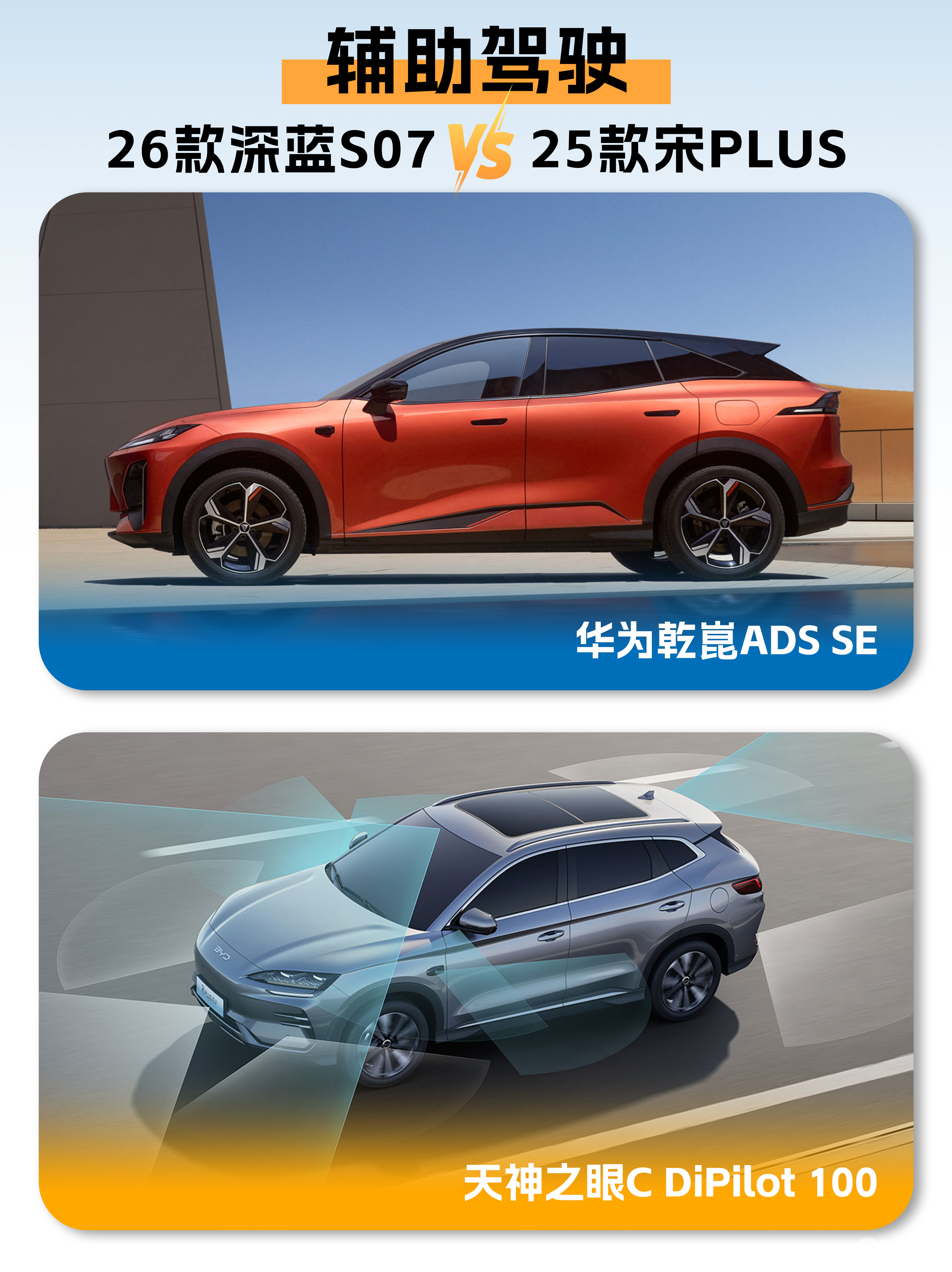 深蓝S07搭载的华为乾崑ADS SE系统,堪称15万级市场的“辅助驾驶小能手”。这套系统与尚界H5的ADS 4.0师出同门,共享华为自研的高阶算法。硬件配置包含10个摄像头、3个毫米波雷达及12个超声波雷达,基于华为昇腾MDC算力平台,支持城区LCC Plus城区巡航辅助,智能识别交通信号灯,实时信号倒计读秒,直行红灯减速刹停,绿灯平稳起步,过路口更从容;拨动转向灯拨杆,系统即刻响应,平滑而自信地引导车辆进入目标车道;通过路口前,智能判断正确车道,自动完成变道,避免过路口后进入错误车道导致接管。这对日常通勤的车主来说特别友好,日常上下班的时候,在城市道路中就能让驾驶辅助来接管,不仅将驾驶变简单了,也能缓解工作的焦虑情绪。 相比之下,比亚迪宋PLUS搭载DiPilot 100系统,配置三目800万像素摄像头、5个毫米波雷达和12个超声波雷达,算力为84TOPS。高速NOA领航辅助表现稳定,但城区复杂工况识别性能仍有待提升,部分情况下需人工介入接管。若你追求智能科技和全场景、高阶辅助驾驶功能,深蓝S07显然更具吸引力。