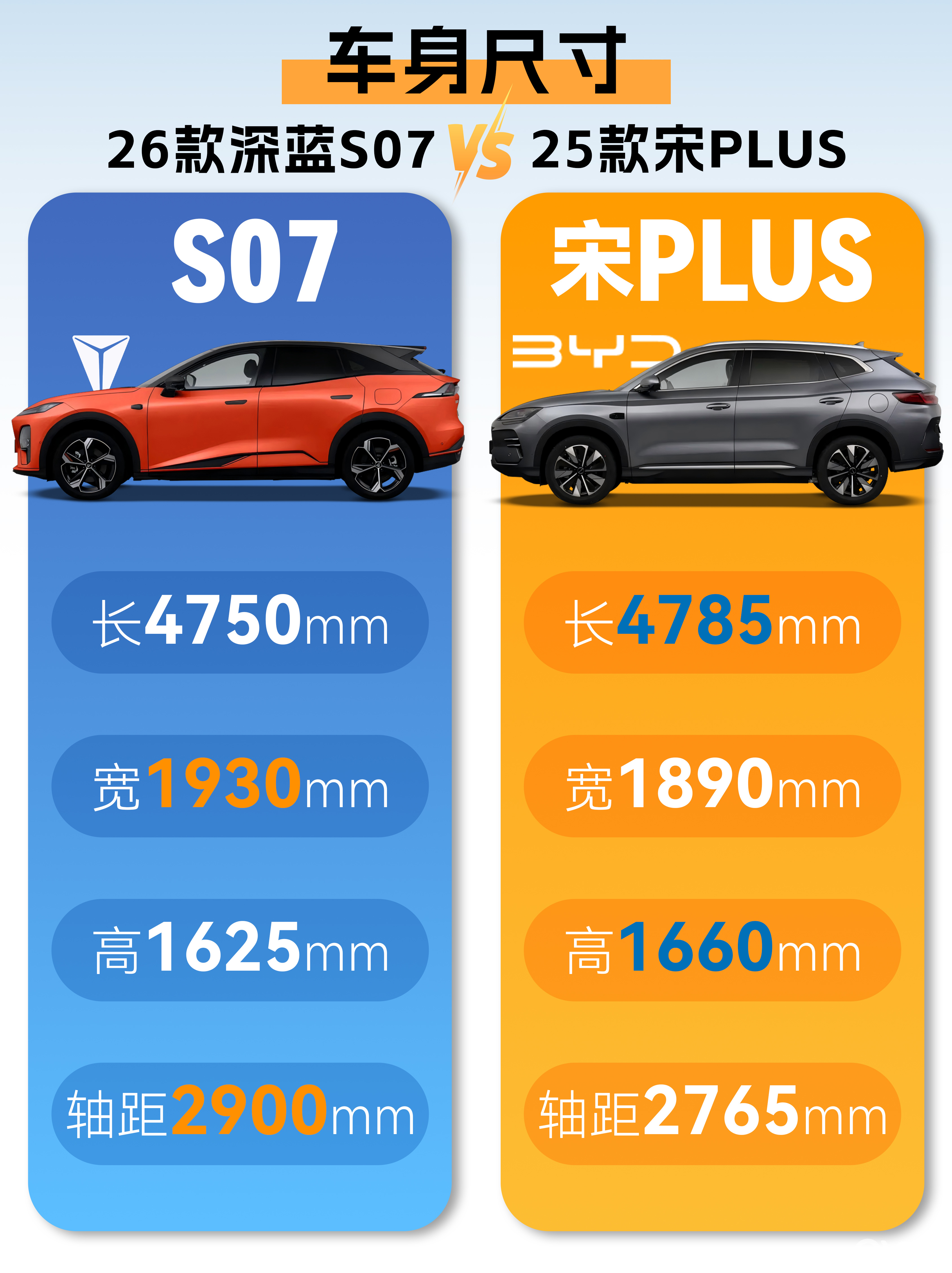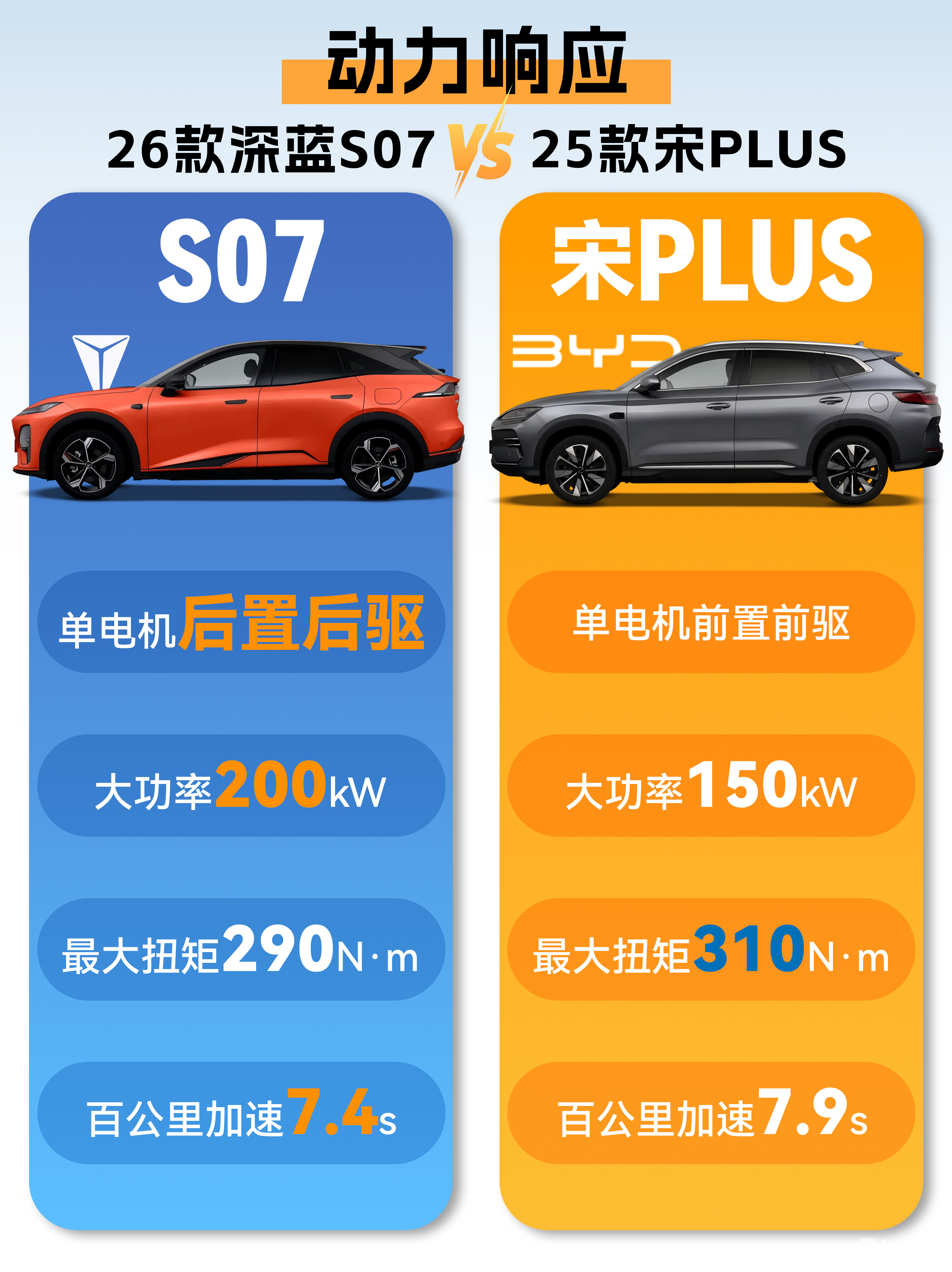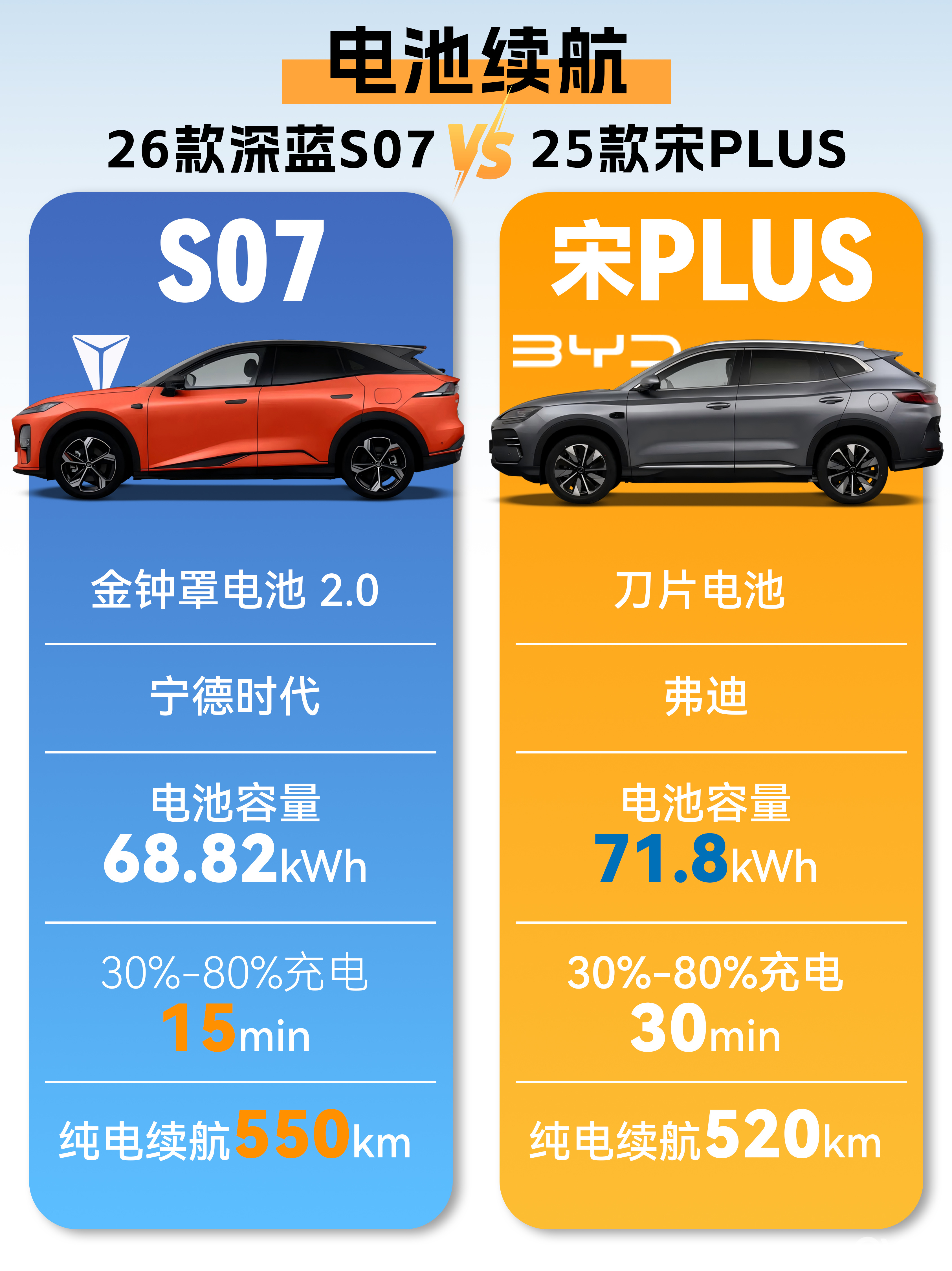 26款深蓝S07再动力上有所升级,从原来的最大功率190kW(258马力)的后置单电机,升级到了最大功率200kW(272马力),最大扭矩290N·m,官方百公里加速时间冲原来的7.6秒升级到了7.4s,动力响应更为迅猛,驾控体验进一步提升。宋PLUS搭载前置单电机,最大功率150kW(204马力),最大扭矩310N·m,官方百公里加速时间7.9s。相较宋PLUS较为保守的动力调校,深蓝S07在城市与高速场景下均展现出更强的加速性能与行驶稳定性,满足用户对高效电驱的更高需求。 深蓝S07纯电版全系搭载宁德时代电芯的68.82度金钟罩电池 2.0,CLTC纯电续航从520公里,升级到了550公里,全系标配3C超充,电池从30%-80%充电时间只要15分钟,高速上开车累了,停在休息区喝杯咖啡的时间就又能上路了。宋PLUS搭载自家弗迪电芯的71.8度磷酸铁锂刀片电池,CLTC纯电续航520公里,没有3C充电倍率,所以电池从30%-80%充电时间是30分钟。不要小瞧这15分钟的充电时间差距,充电速度直接影响用车便利性的,日常城市用车可以在上个厕所、买杯咖啡的时间,就可以快速补能到80%,不用刻意去充电。如果遇到紧急情况需要赶路时,15分钟快速充电功能也可解燃眉之急,这样的充电速度和续航表现,无疑为深蓝S07的用户带来了便利性。