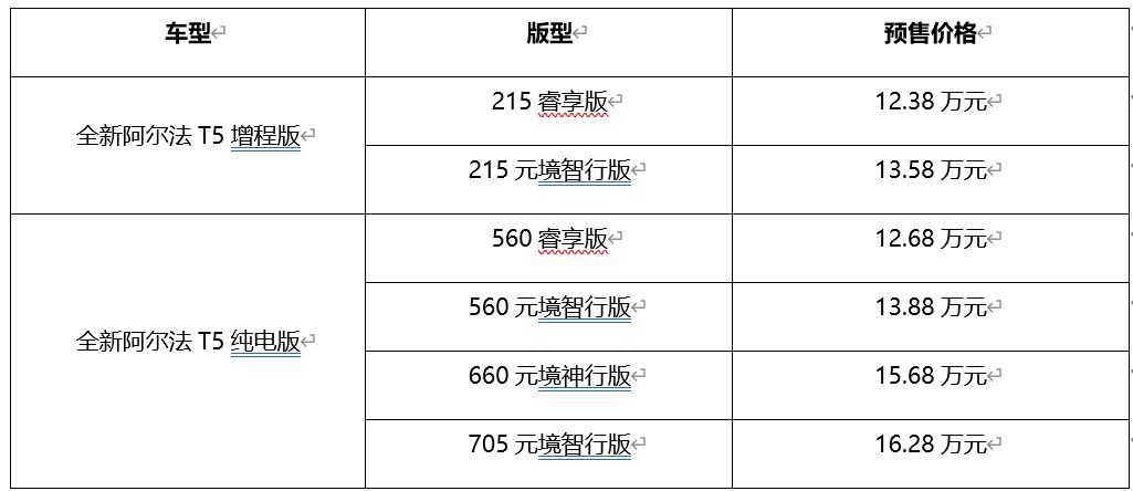 据悉,极狐全新阿尔法T5预售共推出6个版型,包含纯电和增程两种动力形式,预售价格12.38万元—16.28万元,以更年轻的设计风格、更强的动力续航、更智能的操控、更舒适的驾乘和天花板级的安全健康,为年轻家庭用户带来了中级SUV的新选择。即日起通过极狐APP或小程序支付2000元定金,购车可以享受整车5年或12万公里质保、三电终身质保、3年免费不限量数据流量、终身免费OTA升级、价值4999元充电桩安装抵扣券等四重礼遇,再次刷新中级SUV的价值标准!