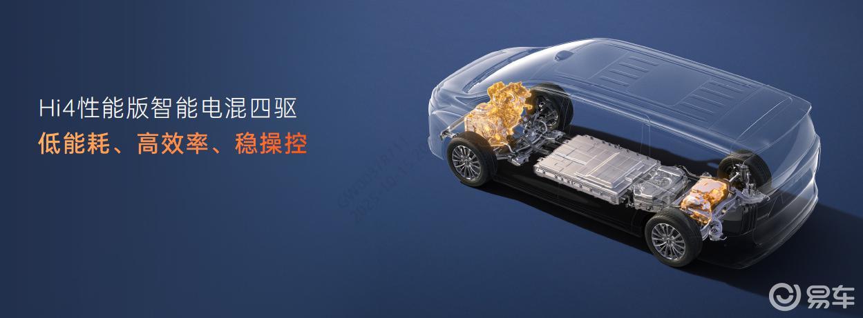 同时,车内配备17.3英寸后排娱乐屏、23扬声器杜比全景声音响及12.5L智能冷暖冰箱,打造沉浸式座舱体验。性能方面,新车标配Hi4性能版智能电混四驱系统,综合功率337kW,零百加速5.7秒,WLTC纯电续航172km,配合全铝五连杆悬架兼顾动力与舒适性。安全设计上,车身采用81.96%高强度钢,A/B柱使用2000MPa热成型钢,电池系统通过89项安全测试,成为首款获中汽中心“零甲醛”认证的MPV。