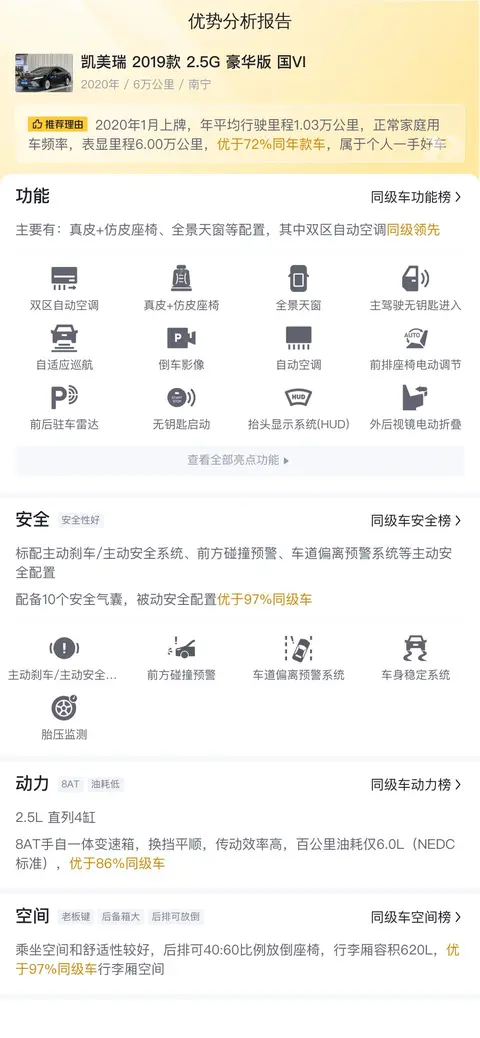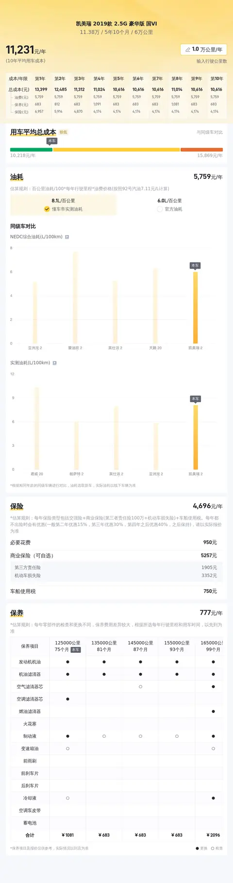 同级车的最低10年平均用车成本是11265元/年,最高是16446元/年,凯美瑞 2019款 2.5G 豪华版 国VI是11438元/年,用车成本较低。