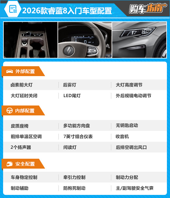 2026款睿蓝8的入门车型配置水平有限,所提供的功能较为基础,仅能满足简单代步需求,甚至连多媒体触控屏都没有配备,所以此次并不推荐。