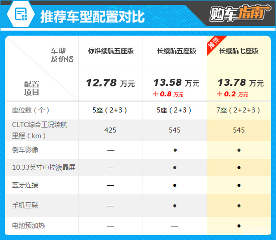 通过配置对比可以看出,推荐车型相比入门的标准续航五座版,不仅续航里程显著提升,还拥有七座布局,空间更加灵活,能够适应多样化的出行场景。同时,配置上还增加了10.33英寸中控液晶屏、倒车影像与蓝牙连接等,日常用车便利性大大提升。