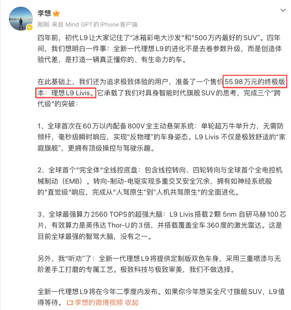 不过现在还没有新车上市的具体时间,按照理想CEO李想在社交媒体所透露的信息来看,全新一代理想L9暂定于今年第二季度发布,所以我们推测它上市或许要等到第三季度,比如2026年成都车展期间。但有意思的是新车价格倒没有遮掩,还是李想在社交媒体所公布的内容显示,这次全新一代L9将提供一款终极版,也可以理解为最顶配,官方将之称为L9 Livis,该车型的售价会是55.98万元。关键现款在售的2025款车型高配版本才43.98万元,等于价格直接拔高12万,这令人十分好奇究竟会是哪些升级能让人觉得这12万花值了。