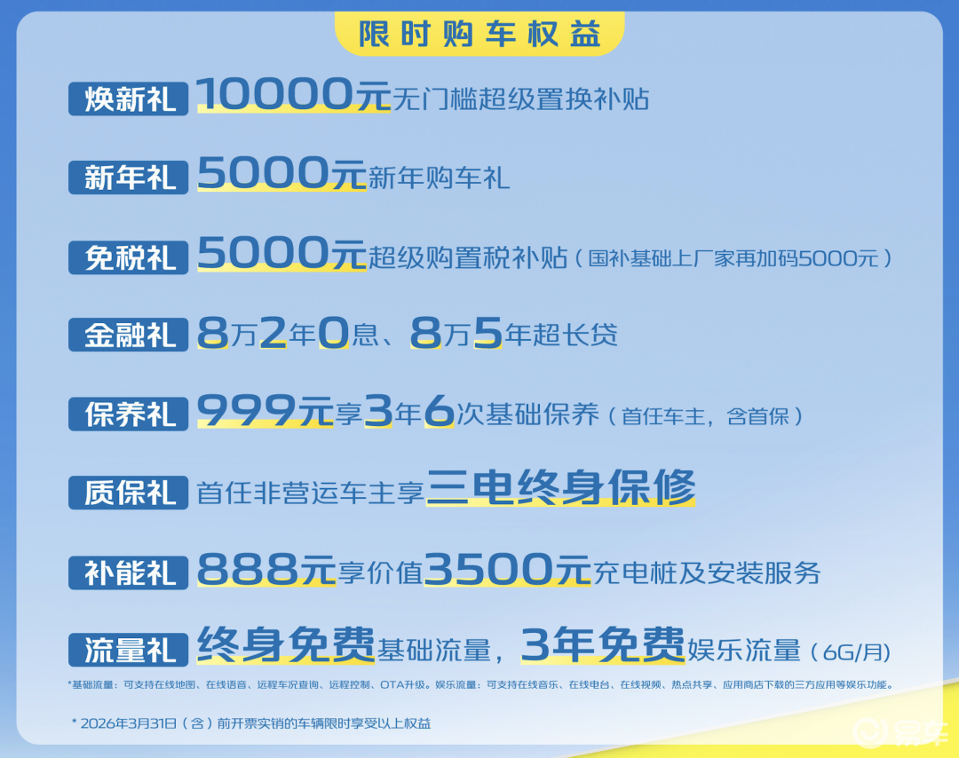 针对购买新款UNI-Z PHEV的车主,长安提供官方10000元无门槛置换补贴、5000元新年购车礼、5000元超级购置税补贴。相当于提供2万元优惠,此外消费者还可享受国家报废或置换补贴,进一步降低购车门槛。针对贷款购车的消费者,长安提供8万元2年0利息,或者8万元5年超长贷方案。另外还有999元享3年6次基础保养,三电终身保修等权益。