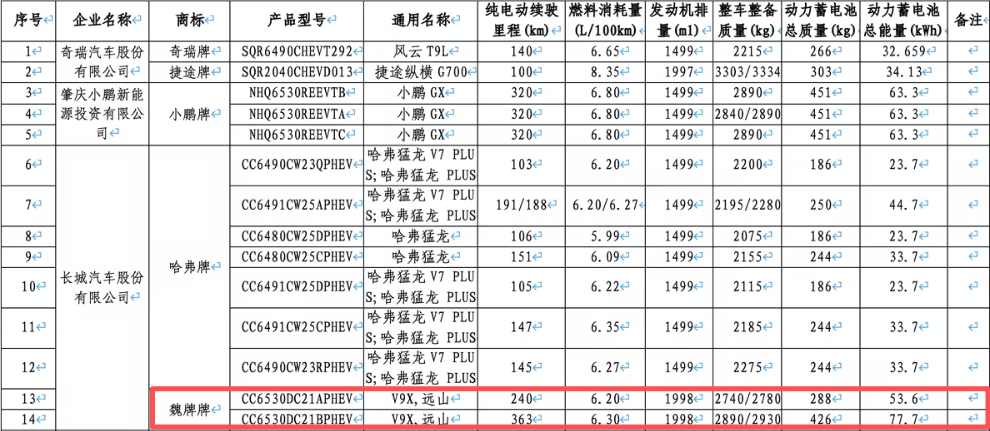 动力与底盘上,魏牌V9X基于800V高压平台打造,搭载2.0T插电式混动系统,匹配4档DHT变速箱,馈电百公里加速达4秒级,配备6C超充电池,CLTC纯电续航有望突破400km,充电5分钟可补能200km,此次申报的纯电续航为240km和363km。底盘配备长城自研双腔空气悬架、EDC预瞄悬架及后轮转向系统,提升行驶稳定性与灵活性。