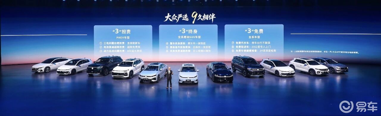 除了新车,发布会上,一汽-大众同步推出“大众严选9久相伴”专属承诺,依托“三担责、三终身、三免费”九项权益,覆盖客户用车全生命周期,彰显领军品牌的责任与担当。