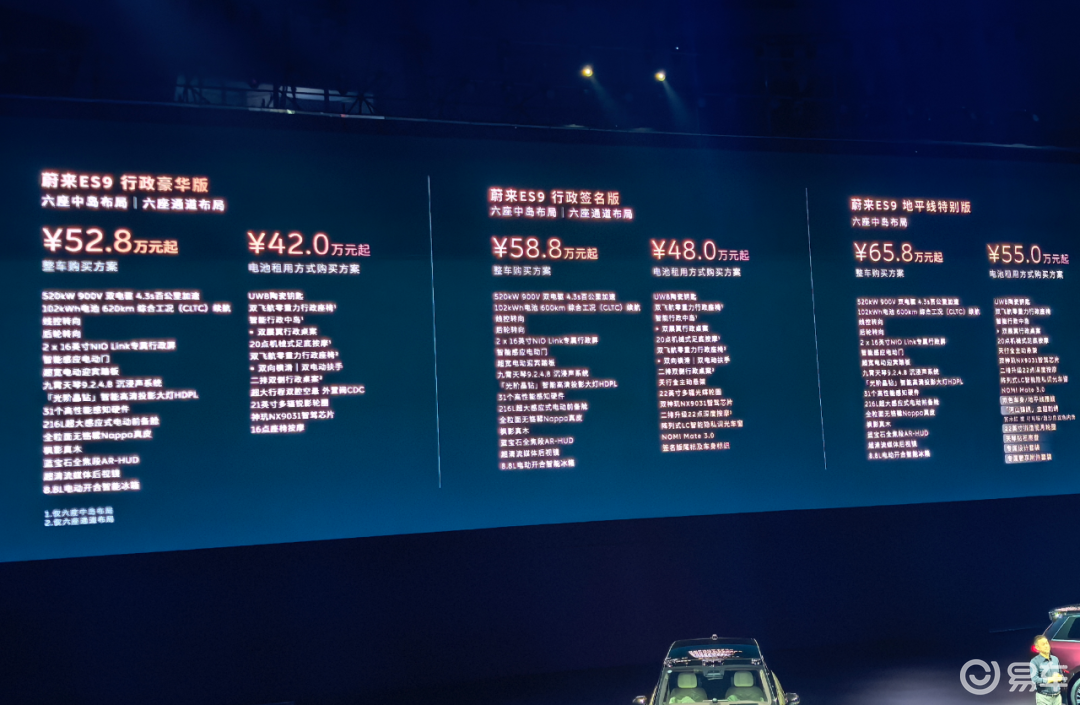 - 行政豪华版:整车购买预售价 528,000 元起、电池租用方式购买预售价 420,000 元起(102kWh 电池租用月费 1,128 元);
