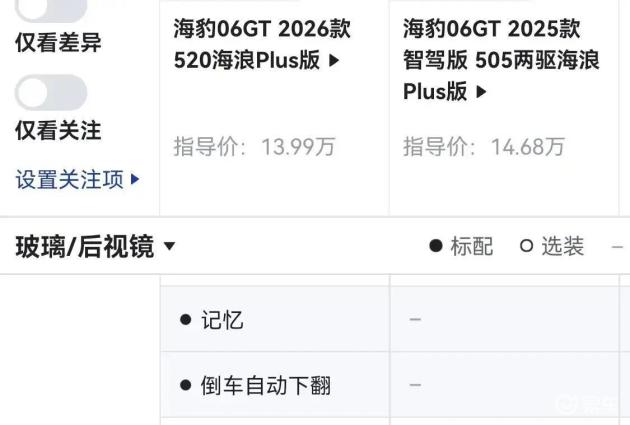 这次选取的对照是海豹06GT 2026款520海浪PLUS,指导价13.99万元,对比海豹06GT 2025款智驾版505两驱海浪PLUS,指导价14.68万元。两车价差不到1万元,但覆盖了动力、补能、配置与底盘等多个层面,正好能检验是否存在“明降暗减”的情况。