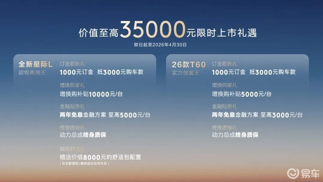 本次上市三款新车精准覆盖用户全场景创富需求,官方定价亲民实在。全新星际L售价10.88-15.98万元,26款星际EV售价24.98万元,26款T60售价7.98-10.18万元。即日起至2026年4月30日,下订用户更能享5重上市礼遇,综合权益至高3.5万元,全方位降低购车与用车成本。
