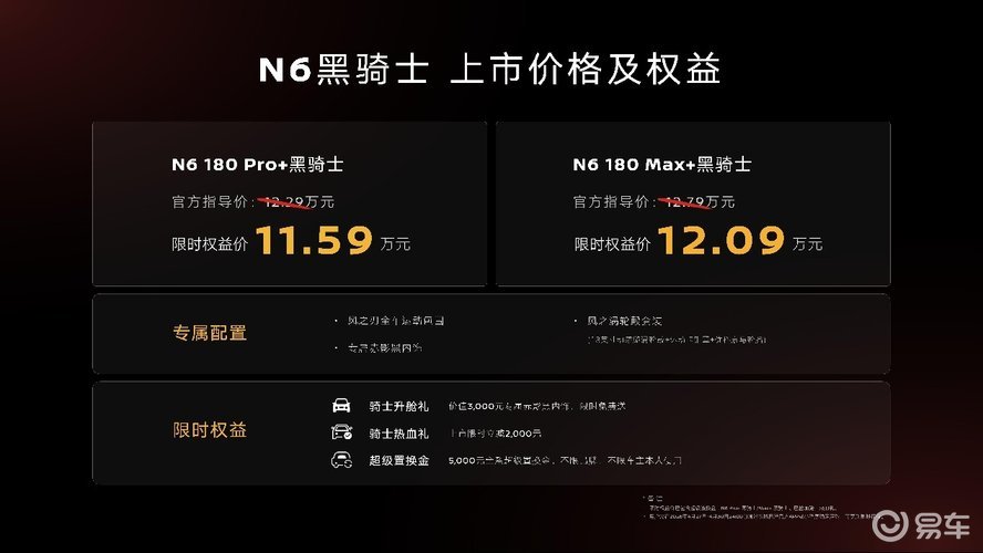 本次上市新车价格体系清晰,限时权益价极具市场竞争力:N6 Pro 青春版限时权益价9.89 万元;N6 黑骑士版推出两款配置,上市限时权益价 11.59 万 —12.09 万元;N7 骑士版提供黑骑士、莱茵骑士双风格共四款车型,上市限时权益价 13.49 万 —14.49 万元。