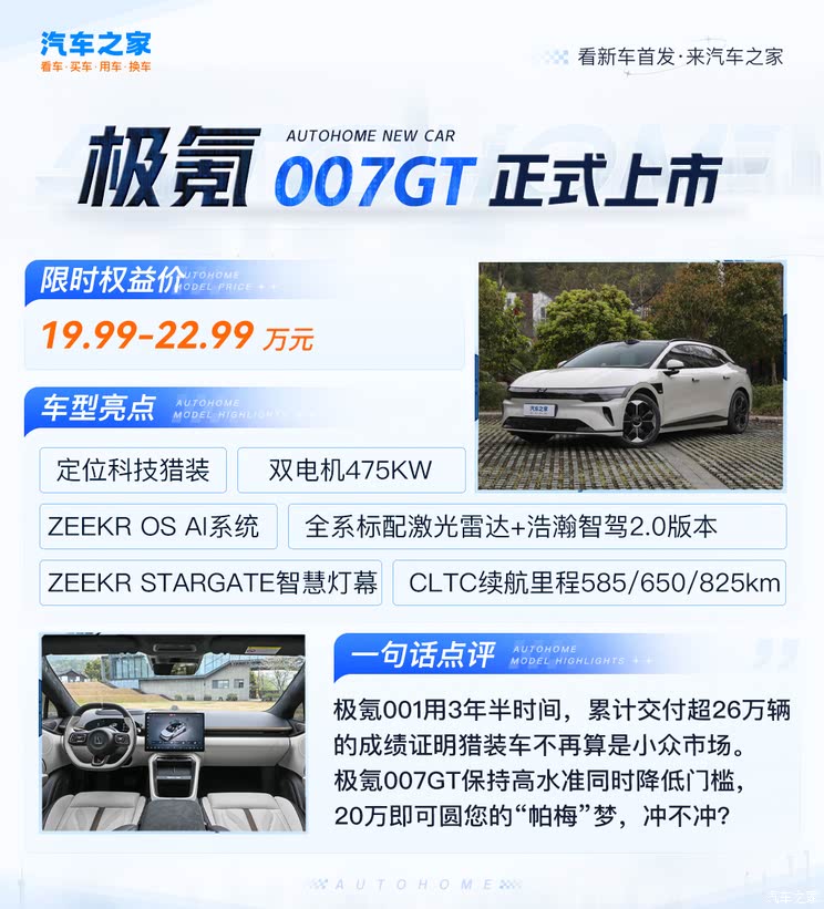 [车讯 新车上市] 4月15日,极氪007GT正式上市,新车共推出3款车型,售价区间20.29-23.29万元,限时权益价19.99-22.99万元。新车可以看做是极氪007的猎装版本,但它并不仅仅是简单更改了尾部造型,具体都有哪些改变?咱们一起往下看。