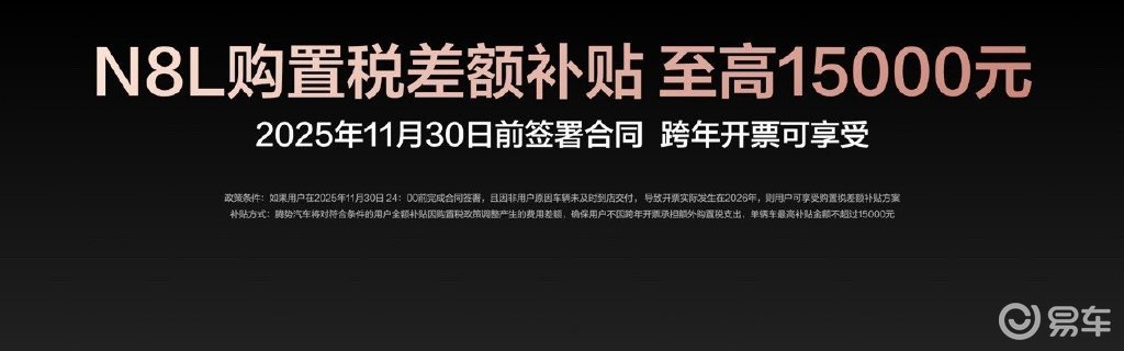 腾势N8L售价为29.98万元-32.98万元,上市以来持续热销,为回馈用户厚爱,推出限时购车权益,价值至高达10.67万元!包括价值1.7万元的三年免息,最高1万元的置换补贴。此外,在2025年11月30日24点前完成合同签署的用户,如果因非用户原因车辆未及时交付,导致开票实际发生在2026年,可享受购置税差额补贴,最高1.5万元!用户不必担心因为交车晚,而享受不到购置税补贴。