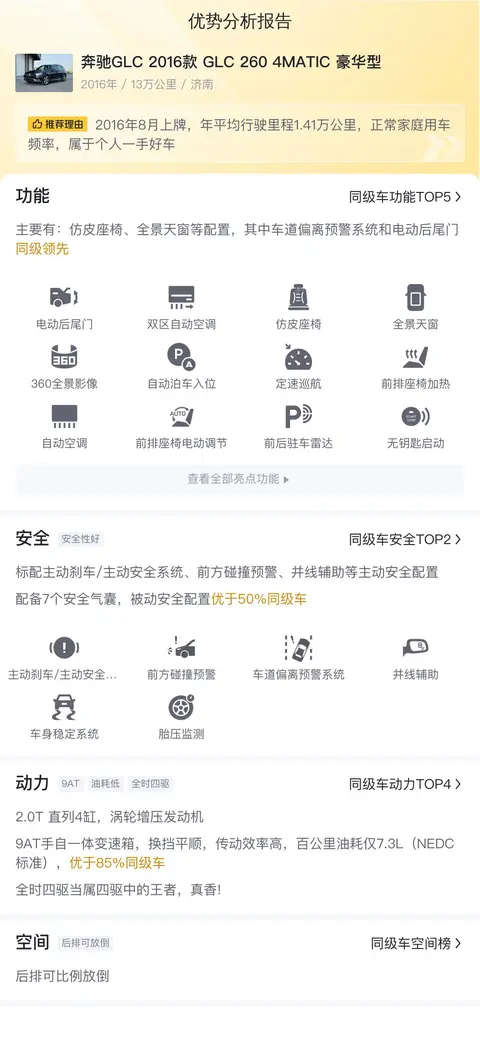 这辆奔驰GLC 2016款 GLC 260 4MATIC 豪华型在10年内的平均用车成本预计为16,569元/年,这包括油费、保养费和保险费等日常维护开支。相比之下,同级别车型的平均用车成本为15,798元/年。虽然这辆GLC的用车成本略高于平均水平,但考虑到其良好的车况、丰富的配置以及奔驰品牌的品质保障,这一成本仍在合理范围内。对于追求高品质驾乘体验的车主来说,稍高的用车成本可能是为了获得更好驾驶感受和更舒适的乘坐环境而付出的必要代价。总的来说,这辆二手GLC的用车成本相对合理,能够满足大多数车主的日常使用需求。