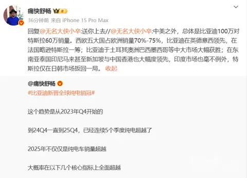 该博主补充道:在中美两大汽车市场之外,总体销量比亚迪以100万辆对特斯拉的60万辆。西欧五大国占据欧洲销量的70%-75%,比亚迪在英国、德国、意大利、西班牙等国家销量领先,仅在法国市场略逊于特斯拉一筹。在其他中大型市场,如土耳其、澳大利亚、巴西、墨西哥等,比亚迪均大幅获胜。在东南亚地区,泰国、印尼、马来西亚,甚至新加坡与中国香港市场,比亚迪也占据着绝对领先地位,印度市场同样如此。特斯拉仅在日韩市场挽回些许局面。