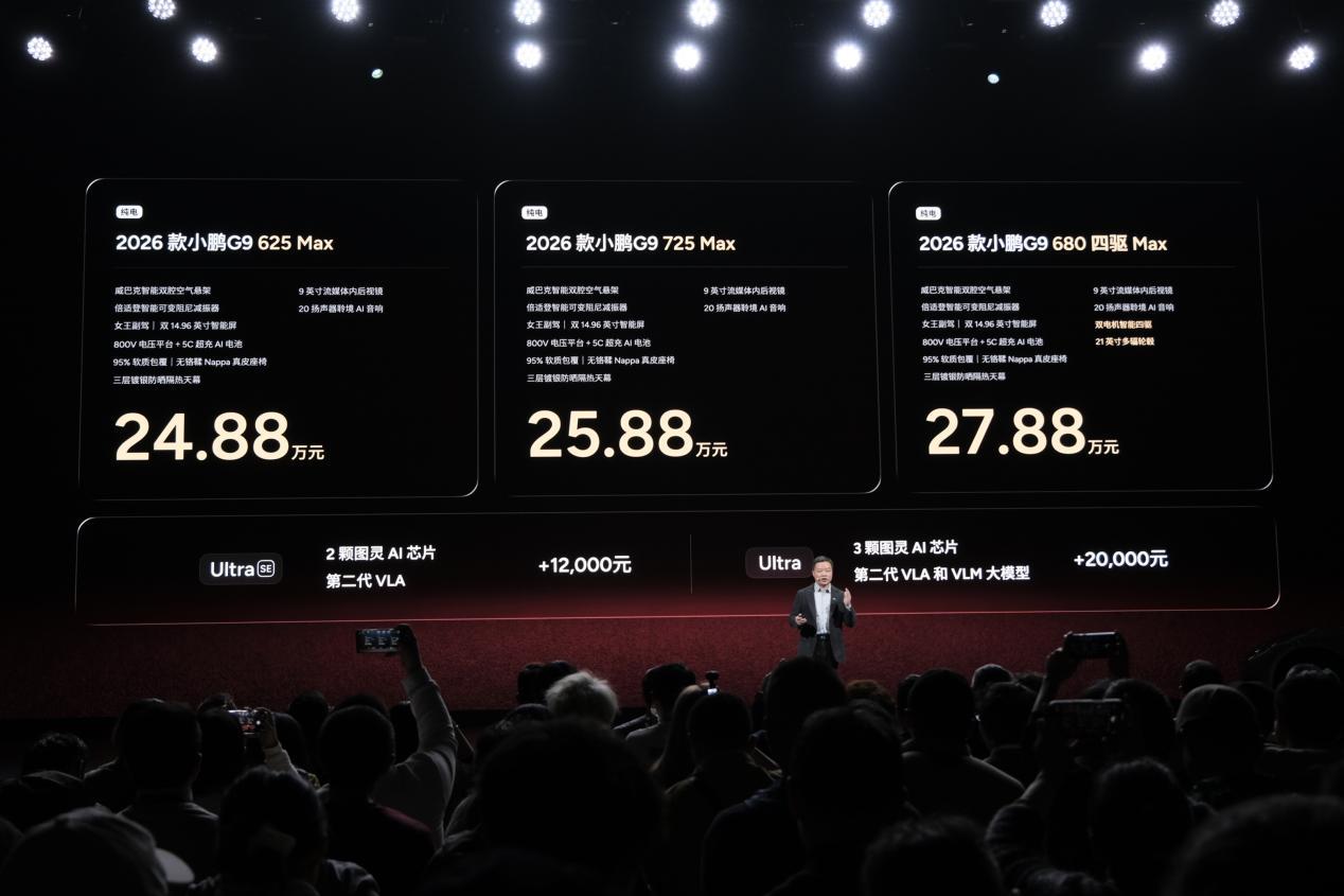 2026款小鹏G6共推出2款车型,官方售价区间为17.68-18.68万元;小鹏G9共推出3款车型,官方售价区间为24.88-27.88万元。这两款车型作为改款车型,主要针对车机芯片进行了升级,并增加了全新配色,其它配置与老款无差异。