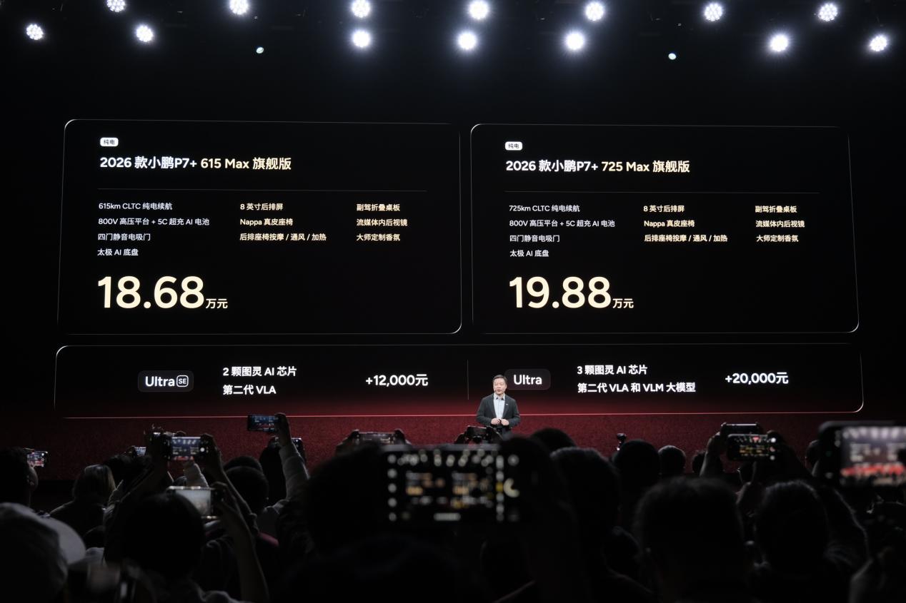 2026款小鹏P7+共推出4款车型,官方售价区间为18.68-19.88万元。作为焕新版车型,2026款小鹏P7+具备104项更新升级以及36%一级总成件换新升级,新车将提供纯电和增程两种动力可选,配备800V架构、5C超充AI电池,纯电版续航725km,增程版纯电续航430km,综合续航1550km。