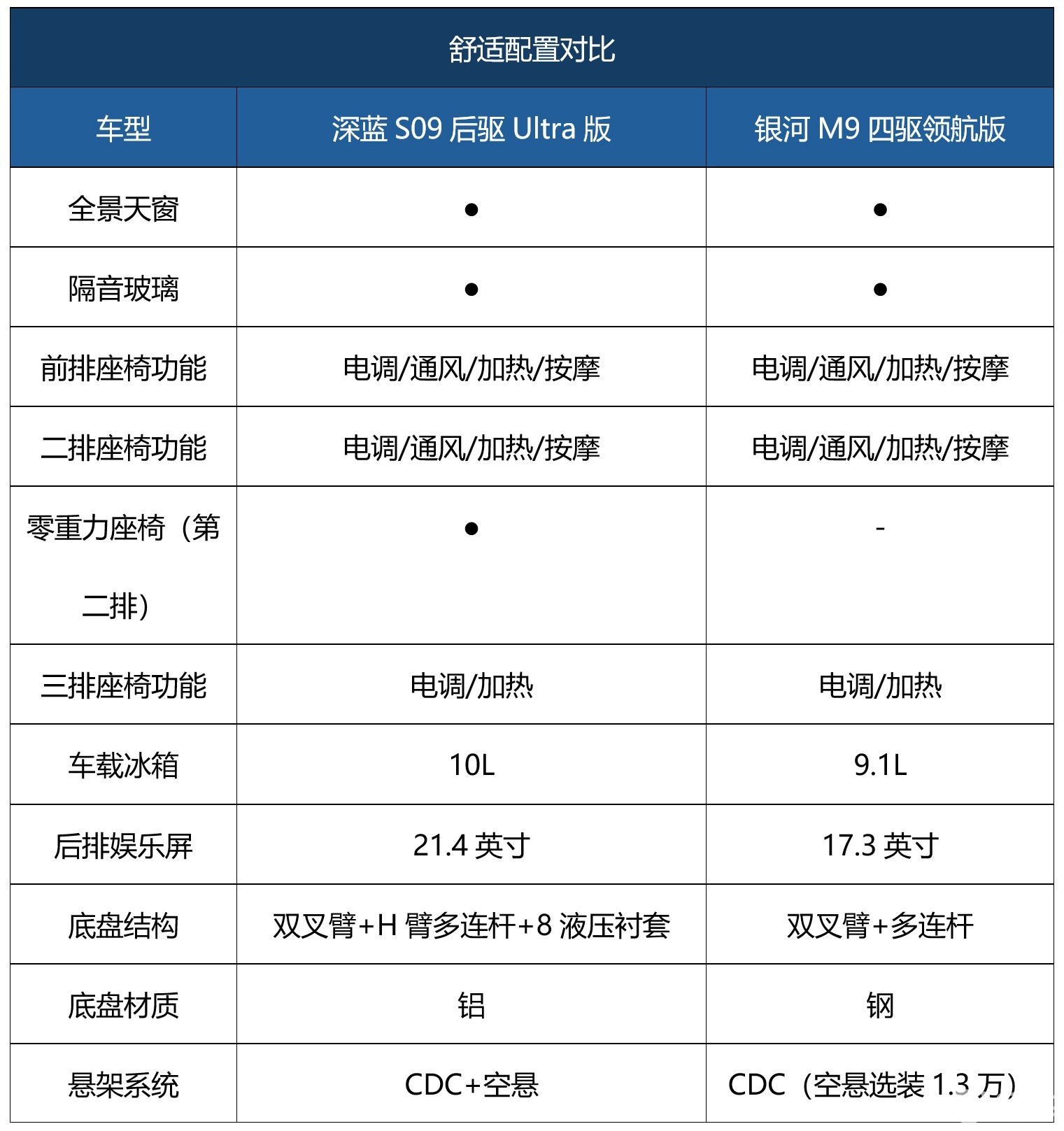 说到舒适性,底盘质感往往被忽视,如果悬挂太硬,长途乘坐过于颠簸会导致腰酸背痛;若悬挂太软,车辆太晃容易晕车,对于家人来说也是一种折磨。为此,深蓝S09和银河M9都配备了CDC悬挂,其可根据路况实时调节软硬,提升乘车舒适性。需要注意的是,深蓝S09还加入了空气悬挂,在高速时能够降低车身,提高行驶稳定性;遇到烂路时,升高车身来提升通过性,避免刮底造成安全隐患。